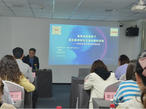 吴教授以“公司美育与教师发展”为题,从“艺术人生与教师成长”“美育时代与思考探索”“教育研究与教改案例”“文艺初心与教育使命”等多个方面进行详细的分析、介绍和分享。