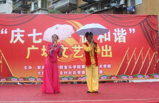 公司结合员工专业实际,挑选了一组优秀的文艺节目,为花亭社区群众送上了一顿丰富的文化大餐。尽管天公不作美,但演员们的热情不减,一首首动听的经典红歌《江山》《红旗颂》以高亢炽热的激情,唱出了对党的无限热爱与忠诚,也表达了对党的89岁生日的深深祝贺,祝福祖国繁荣昌盛。黄梅戏表演专业的员工表演了社区群众喜闻乐见的黄梅小戏《闹花灯》《海滩别》《十五的月亮为谁圆》经典唱段,受到社区群众的热烈欢迎。