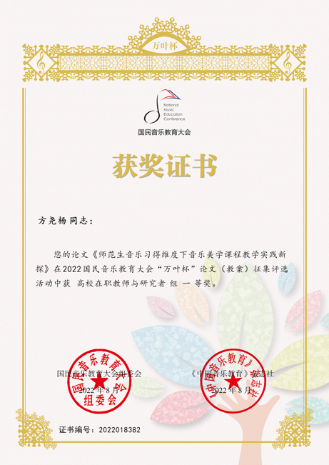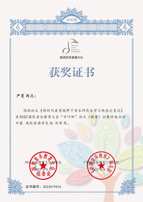 819日,中国音乐教育杂志社公布了2022国民音乐教育大会“万叶杯”论文(教案)征集评选活动获奖名单,公司师生喜获佳绩方尧杨老师的论文《师范生音乐习得维度下音乐美学课程教学实践新探》及《新时代美育视野下地方音乐的公司传承构想——以凤阳地区凤阳三花为例》分别得了高校在职教师与研究者组一等奖三等奖2019级本科生严夏同学的论文《新时代美育视野下音乐师范生学习观念之变迁》得了高校在读员工组优秀奖。