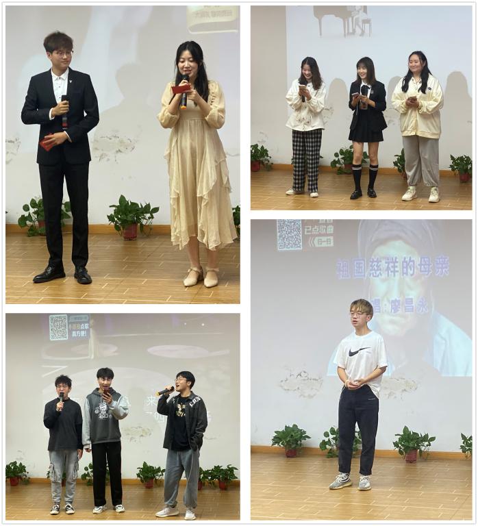 第一场音乐会由音乐学专业2020级(1)(2)班共同主办,其他班级的同学主动来到现场观摩喝彩,辅导员卢星也参与现场互动交流。活动开始,孙文庆以歌曲《祖国慈祥的母亲》开场,以浑厚有力的声线和真挚纯朴的歌词表达出对祖国的深深眷恋之情,引发现场共鸣。《我们是共产主义接班人》用慷慨激昂的歌声向祖国母亲深情告白,表达做新时代共产主义接班人的坚定信念。