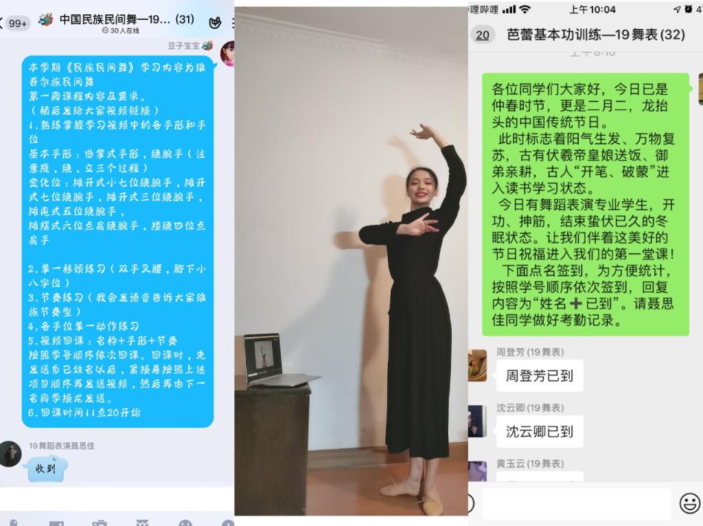 舞蹈教研室的线上教学含《芭蕾基本功训练》 《民族民间舞》 《形体训练与舞蹈编创》等课程,教学内容以旧课复习巩固基本功、新课学习提高现有能力为目标,回课方式采用视频、音频、图片等形式。在教学过程中克服了场地、教具等限制,充分利用QQ,微信开展直播教学。