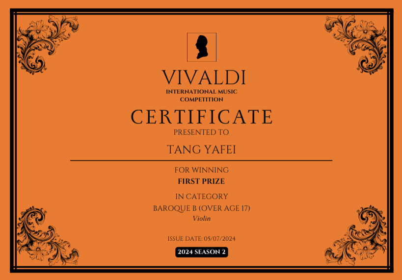 公司青年教师唐雅菲博士在维瓦尔第国际音乐比赛(Vivaldi International Music Competition)2024 season2中荣获BAROQUE B(OVER AGE 17)高级组第一名。