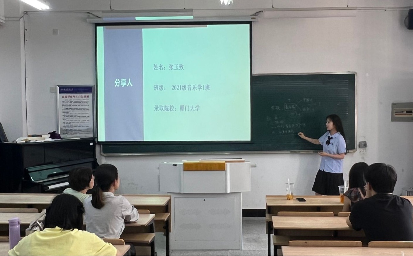 交流会上,音乐学专业2021级(4)班张坤以优异成绩考入浙江传媒公司声乐表演方向,他结合自身经历,从“院校选择策略”“考试重点环节”等角度展开分享,建议学弟学妹通过分析院校特色与自身优势精准定位目标。2021(1)班张玉致(厦门大学录取)详细解析了分阶段备考计划,强调“基础巩固—强化提升—模拟冲刺”三阶段学习法,并展示了如何高效分配时间与精力。