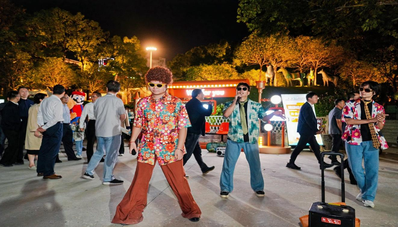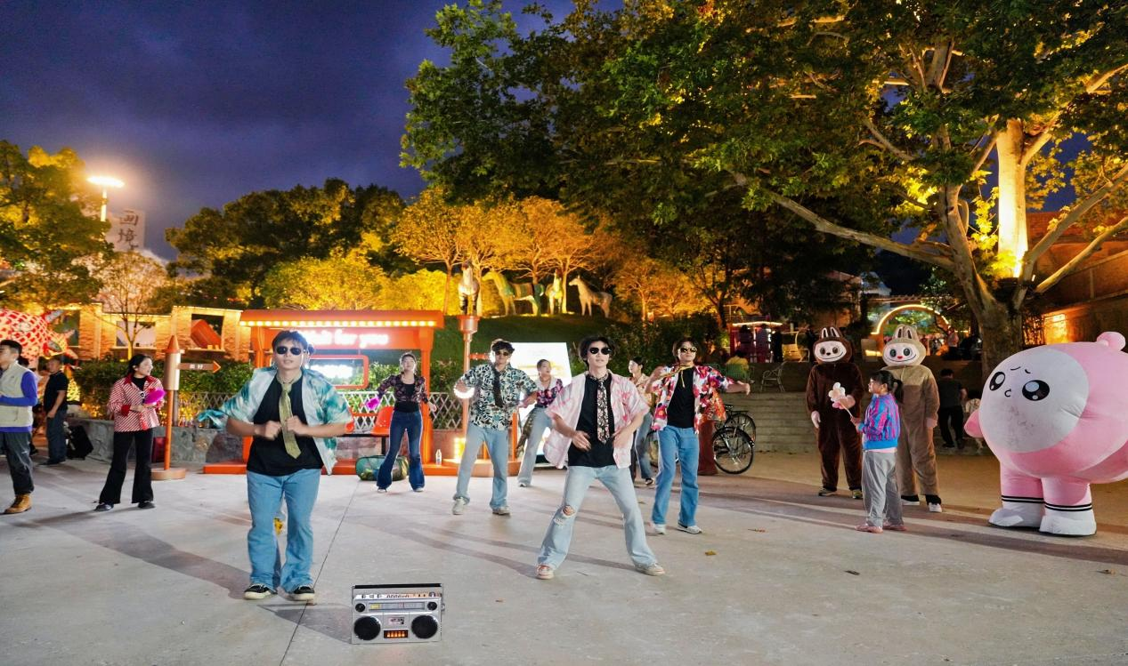 围绕集贤时空的复古基调,公司员工精心策划了“时空年代巡演”主题演出。舞蹈节目选取了《路灯下的小姑娘》《夜上海》《莎啦啦》《冬天里的一把火》等经典曲目,演员们身着八十年代标志性的迪斯科服装,肩扛老式收音机,骑着二八大杠自行车,车上载满铁皮青蛙、泡泡胶等复古玩具,瞬间将观众带入往昔岁月。歌曲演绎环节,小虎队的《爱》、闽南语金曲《爱情才会赢》等旋律响起,引发全场共鸣。此外,跳皮筋、跳房子、丢沙包等互动游戏更是吸引游客踊跃参与,同学们将玩具作为奖励赠送,现场气氛热烈,欢声笑语不断。