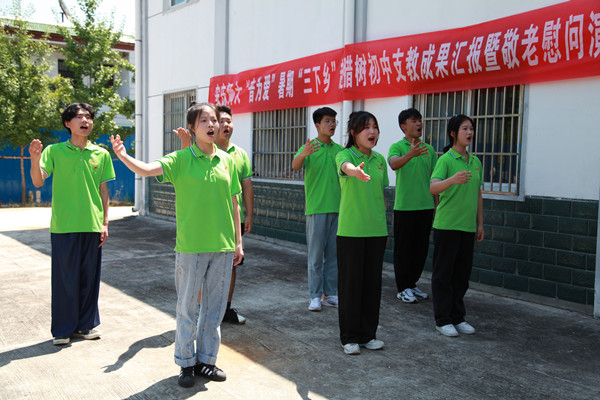 一支手舞《国家》彰显家国情怀、一弹《南泥湾》再忆革命精神、一奏《烟雨江南》描绘朦胧诗意……在腊树镇敬老院里,一群“红领巾”在“小老师”们的带领下,将十多天所学的“吹拉弹唱”本领尽数呈现,赢得了一致好评。