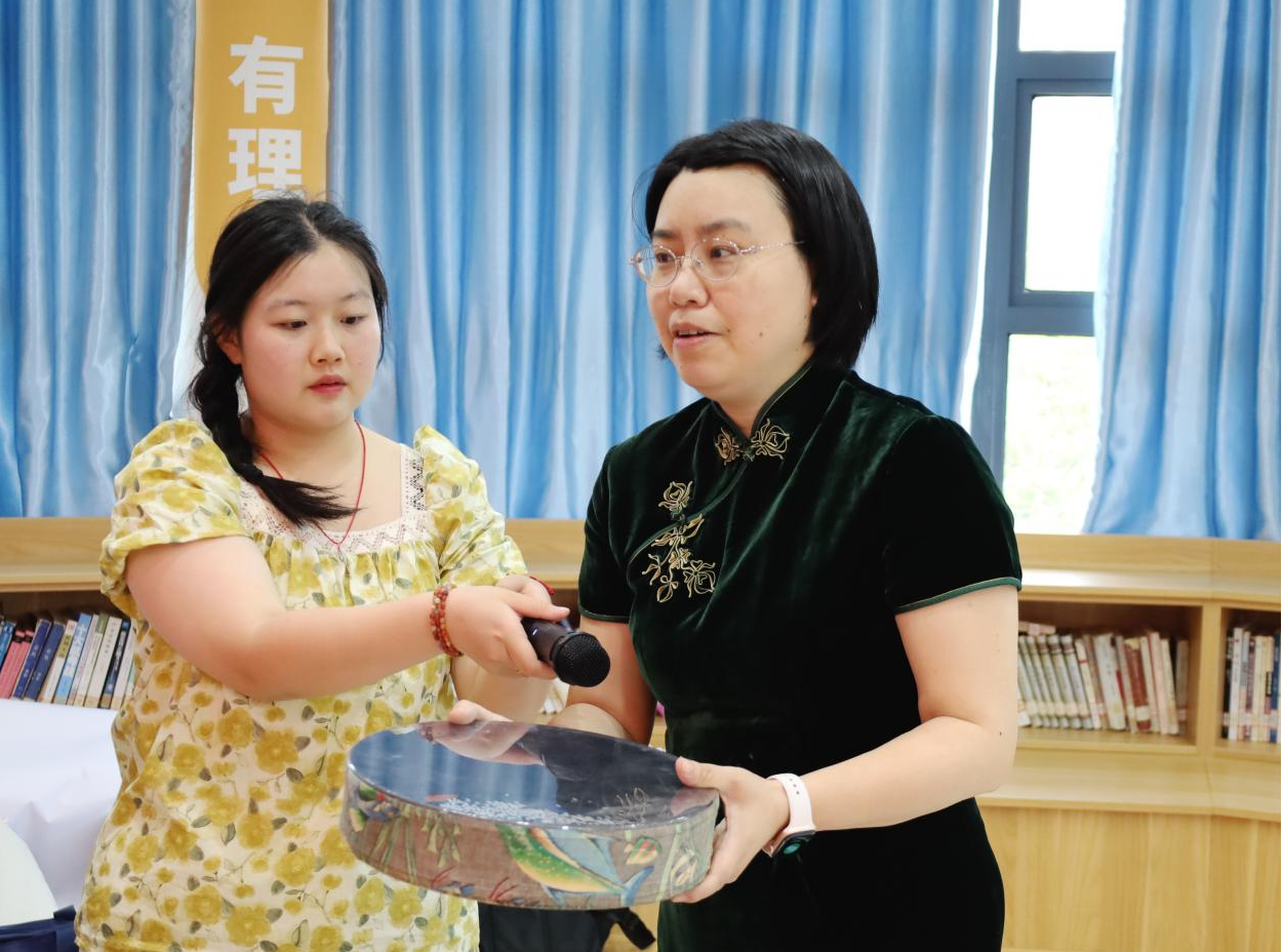 一根四五十厘米长的棍状乐器在员工间传递,大家纷纷伸手触摸,猜测其材质与原料。音乐学专业2024(3)班的陶艺反复摩挲表面纹路,轻轻叩击后说:“摸起来凹凸不平,有点粗糙,但不扎手,手感很特别。”经赵元揭秘,该乐器是用掏空的仙人掌枝干制成的雨声筒。“本以为仙人掌制成的乐器会很扎手,没想到触感意外温和。触摸着筒身纹路,听着雨声筒发出淅淅‘雨声’,感觉像有双温柔的手,抚平了我紧绷的神经。”
