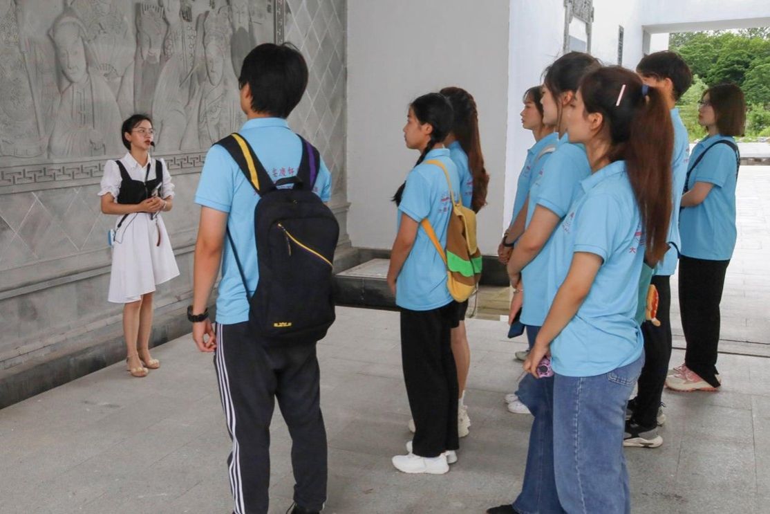 “好香呀!”走进徽班博物馆,香气扑面而来。“馆内到处都体现徽派元素,例如徽派三雕,博物馆内部的梁、戏台都是木雕,所以刚才进门会闻到木质的清香,大门入口处有石雕,同光名伶十三绝是砖雕。”跟随讲解员的解说,成员们来到同光名伶十三绝前。“这件作品展现了同治光绪年间,以徽调和昆曲扬名的13名伶,他们将徽调和昆曲转变为京剧,其中有四位与怀宁石牌相关。”经介绍,团队成员了解到石牌与戏曲悠久的历史渊源。