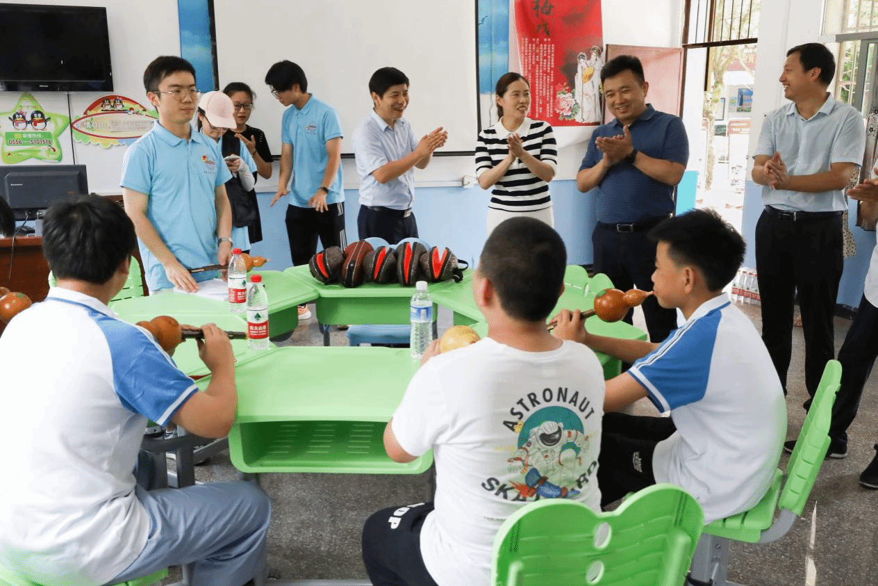 张国栋一行走进实践课堂,观摩了师生团队现场实践教学,充分肯定了员工志愿者们为乡村振兴、基础教育发展贡献青春力量的精神风貌,鼓励青年学子在与实践相结合的“大思政课”中长才干、作贡献,传播美的声音、种下美的种子、收获美的声誉、见证美的绽放。在音乐教室,葫芦丝课程已进行5天,员工们展示了自己的学习成果;公司报告厅中,一“筝”一“扬”将中国古典音乐的魅力发挥得淋漓尽致;“我和我的祖国,一刻也不能分割……”合唱排练室传来歌声,团队成员邀请张国栋等人与员工一同演唱,深情的旋律传递出浓浓的爱国之情……