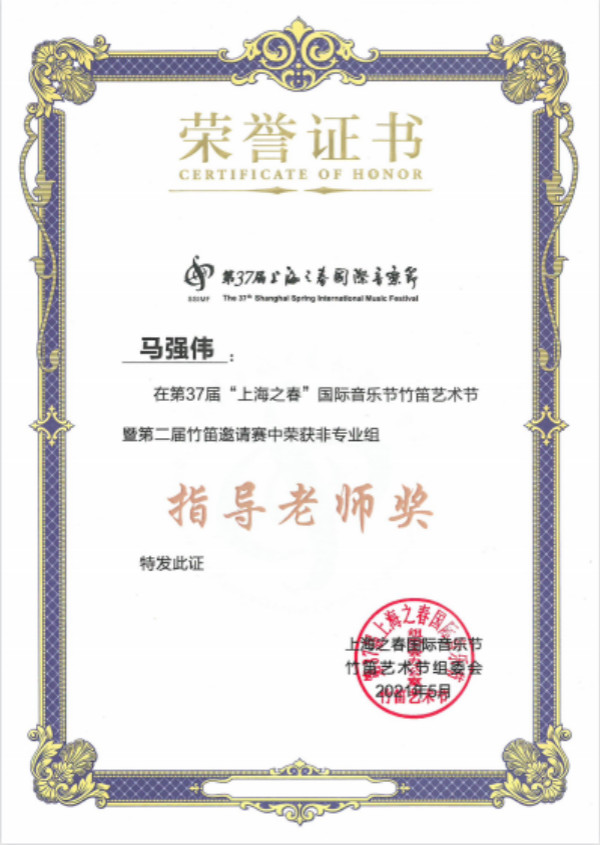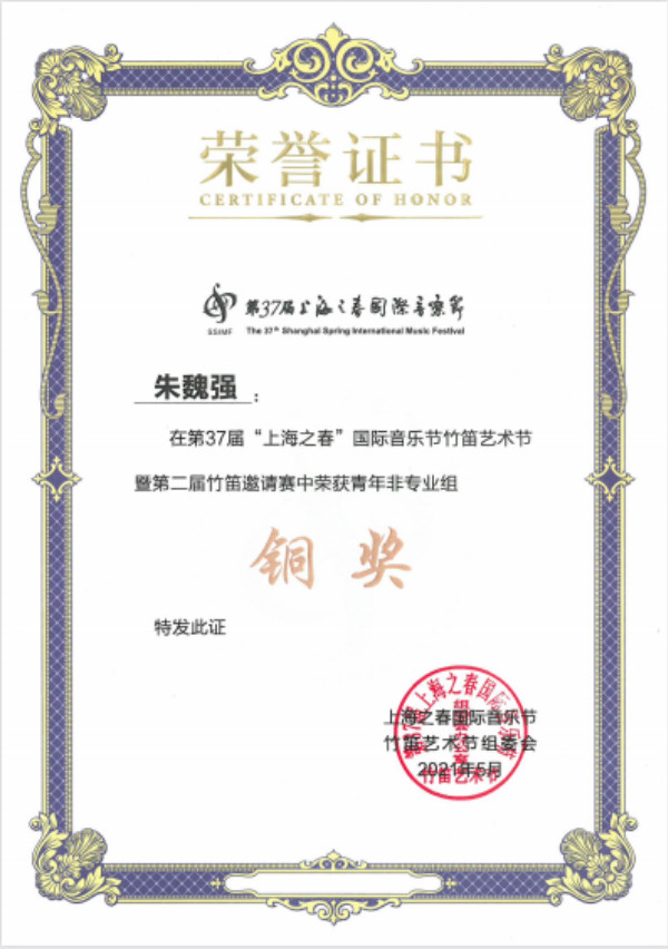 近日,第37届“上海之春”国际音乐节竹笛艺术节暨第二届竹笛邀请赛获奖名单公布,公司音乐学专业2017级(2)班朱魏强获全国铜奖,马强伟获指导老师奖。