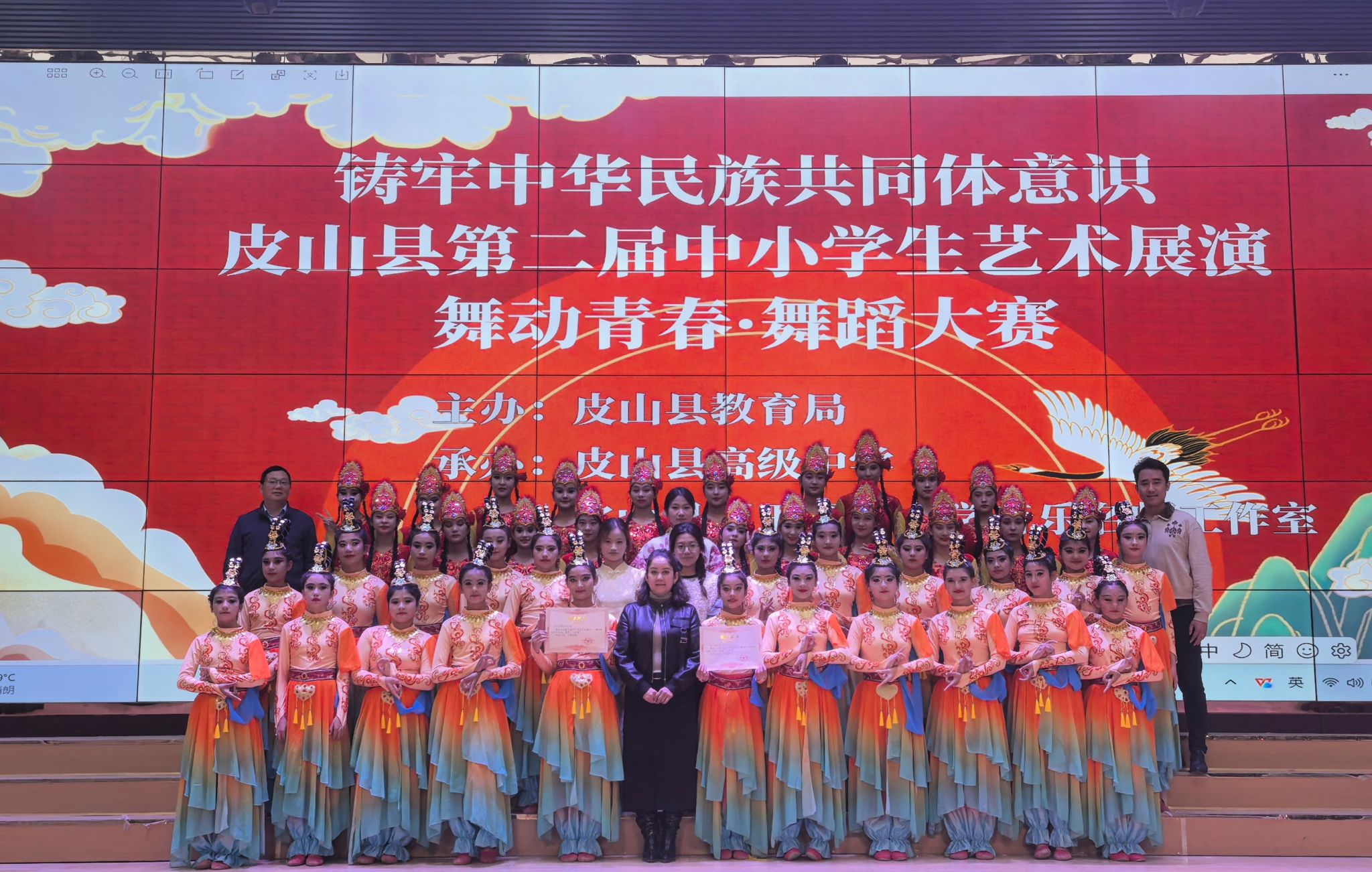10月27日下午,以“铸牢中华民族共同体意识”为主题的皮山县第二届中小员工艺术展演——“舞动青春”舞蹈大赛在皮山县高级中学隆重举行。其中,由公司援疆支教生马凌云指导的舞蹈作品《敦煌飞天》在众多优秀节目中脱颖而出,荣获二等奖。